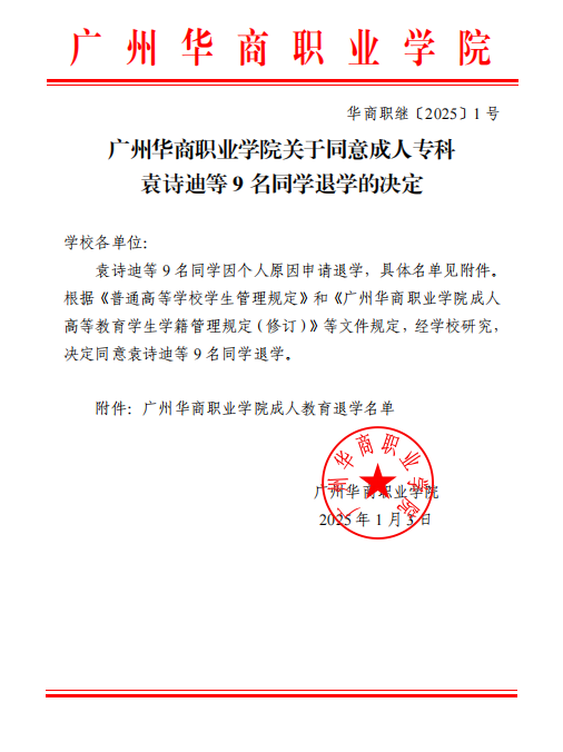 上一条:华商职继〔2025〕2号广州华商职业学院关于同意李永梅等2名成人专科同学变更学籍信息的决定